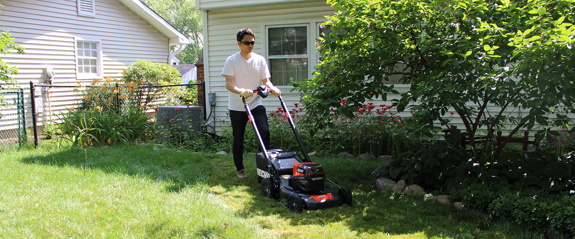 Key features include a spring preloaded, central height adjustment system with 7 positions, automatic speed control with a boost override function, and a dual-battery port that automatically switches between batteries for extended run-time. The mower’s design emphasizes user comfort and convenience with a cushioned, symmetric handle, vertical storage capability, and LED lights for low light operation.